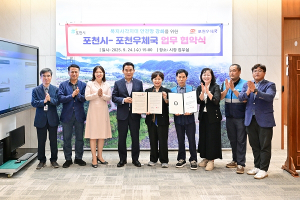 이번 협약을 통해 포천시는 복지 위기가구를 신속하게 발굴하고 지원하는 시스템을 강화하는 한편 포천우체국은 사회적 역할을 확대해 지역사회와 상생하는 모범 사례가 될 것으로 보인다.