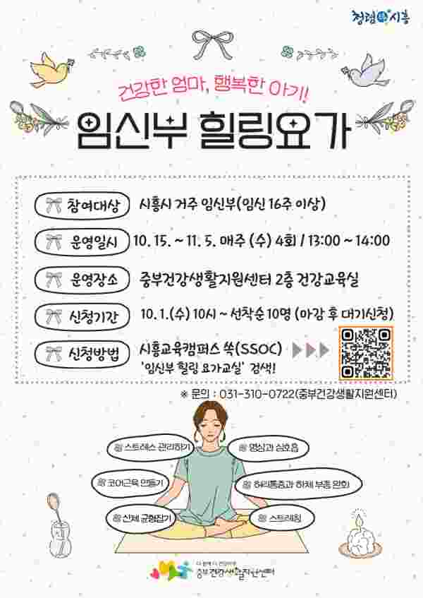 [금요저널] 시흥시보건소 중부건강생활지원센터는 임신부의 신체적·정신적 건강 증진을 위해 오는 10월 15일부터 11월 5일까지 ‘임신부 힐링 요가교실’을 운영한다.