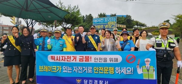[금요저널] 당진경찰서는 25일 계성초등학교 사거리에서 픽시자전거 사고 예방을 위한 유관기관 합동 캠페인을 실시했다.
