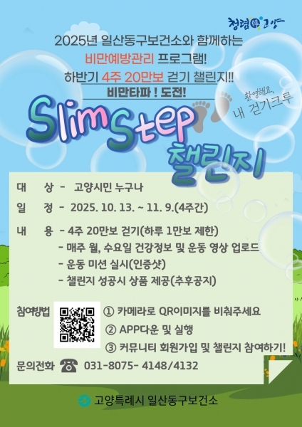 [금요저널] 고양특례시 일산동구보건소는 지역주민의 비만예방과 신체활동 증진을 위해 오는 10월 13일부터 11월 9일까지 4주간 20만보 걷기 ‘ Slim Step 챌린지’를 운영한다고 밝혔다.
