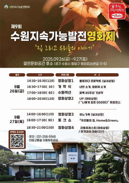 수원지속가능발전협의회가 주최하는 제9회 수원지속가능발전영화제는 삶의 공간으로서의 집을 새로운 시각에서 바라보며 지속가능한 도시와 공동체의 의미를 살펴본다.