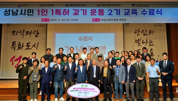 [금요저널] 성남산업진흥원은 9월 24일 대강당에서 ‘성남시민 1인 1특허 갖기 운동’ 제2기 교육 수료식을 개최하고 시민 지식재산 역량 강화의 성과를 공유했다.
