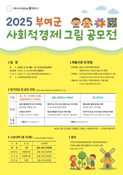 [금요저널] 부여군지역공동체활성화재단 사회적경제지원센터는 관내 어린이와 청소년을 대상으로 ‘2025 사회적경제 그림 공모전’을 개최한다고 밝혔다.