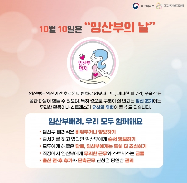 올해로 제20회를 맞는 임산부의 날은 ‘모자보건법’에 따라 제정된 법정 기념일로 풍요와 수확을 상징하는 10월과 임신기간 10개월을 의미하는 10월 10일이다.