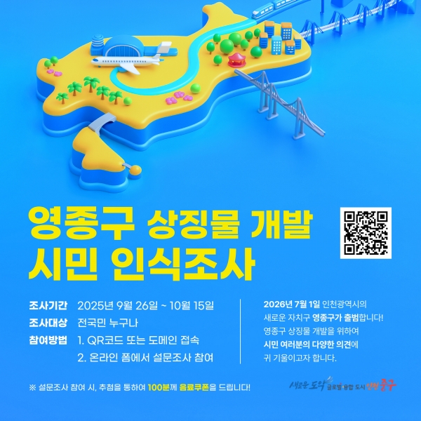 [금요저널] 인천시 중구는 인천형 행정 체제 개편에 따라 2026년 7월 1일 공식 출범을 앞둔 ‘영종구’의 정체성과 미래 비전을 담은 ‘상징물’ 개발에 본격 돌입했다고 26일 밝혔다.