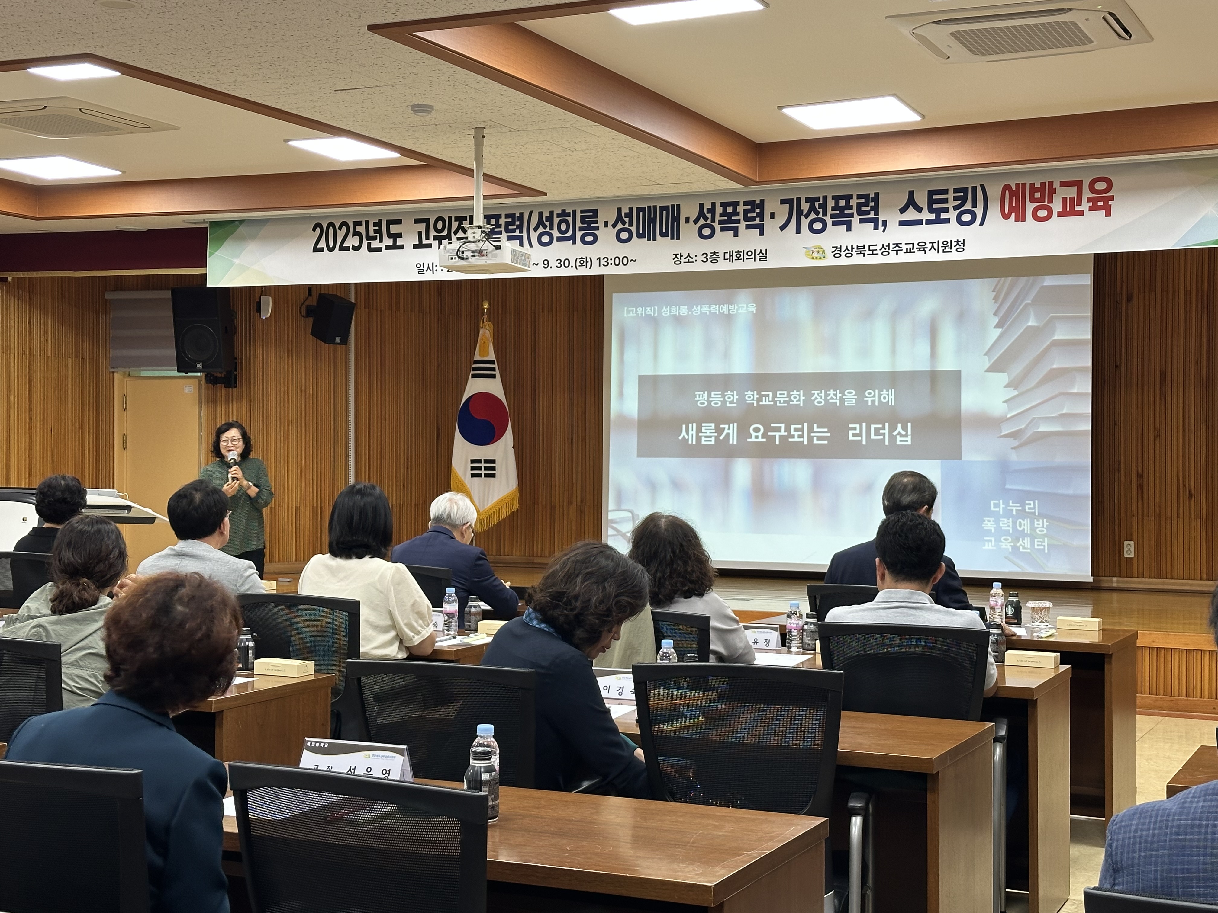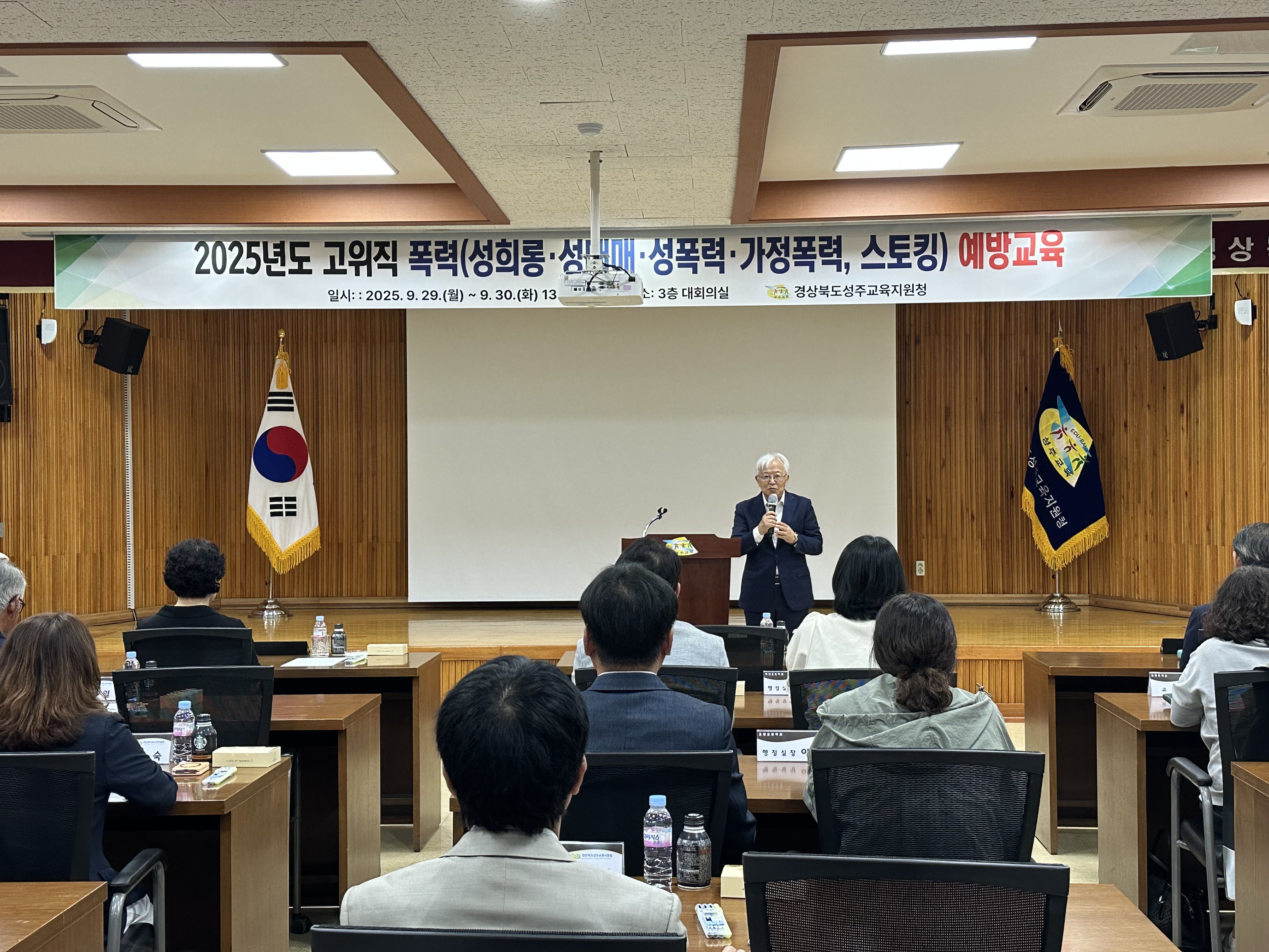 □ 경상북도성주교육지원청(교육장 김시용)은 2025년 9월 29일(월), 9월 30일(화) 양일간 성주교육지원청 대회의실에서 고위직 대상 폭력(성희롱·성폭력·성매매·가정폭력, 스토킹) 예방교육을 진행했다.