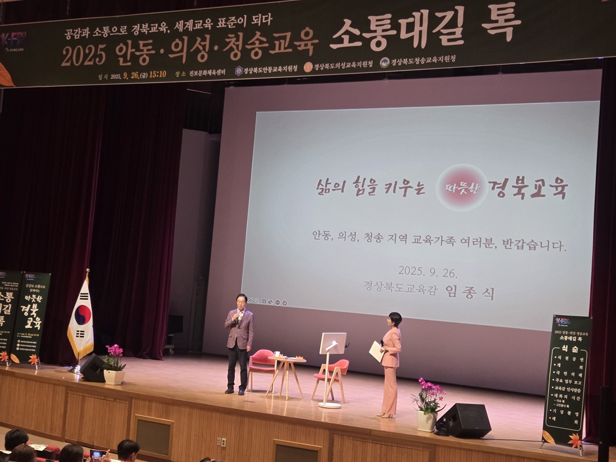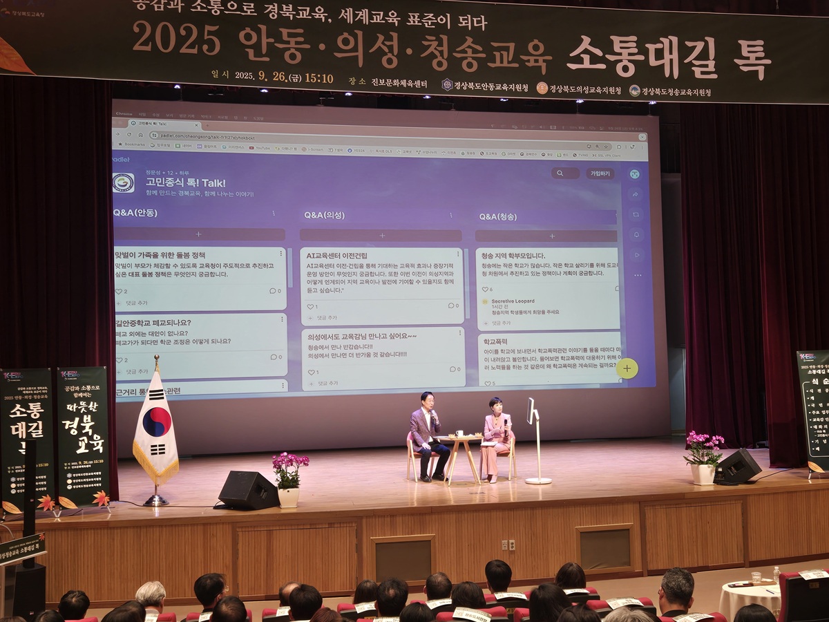 □ 경상북도청송교육지원청(교육장 남정일)은 9월 26일(금) 15시 30분부터 진보문화체육센터에서 교육감과 함께하는‘소통대길 톡’행사를 개최했다. 이번 행사는 교육 현장의 다양한 목소리를 직접 듣고, 이를 교육 정책에 적극 반영하기 위한 소통의 장으로 마련됐다.