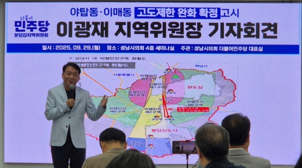 [금요저널] 더불어민주당 분당갑 이광재 지역위원장은 29일 기자회견을 통해 “주민들의 오랜 숙원인 서울공항 주변 고도제한 완화가 결실을 맺게 된 것은 주민들의 인내와 연대, 그리고 함께해 온 노력 덕분”이라고 밝혔다.