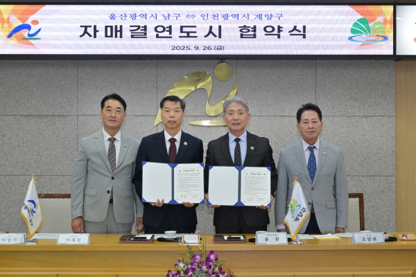 윤환 계양구청장은 “역사와 문화, 산업과 생태가 조화를 이루는 울산 남구와 자매결연을 하게 되어 매우 뜻깊다”며 “앞으로 두 도시가 축제와 산업, 문화 등 다양한 분야에서 실질적이고 활발한 교류를 이어가길 기대한다”고 말했다.