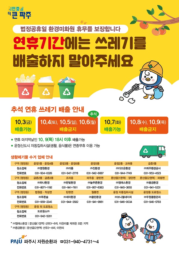 [금요저널] 파주시는 환경미화원 휴무 보장을 위해 추석 연휴 기간인 10월 4일부터 10월 6일 10월 8일부터 10월 9일까지는 생활폐기물을 배출해서는 안 되며 이 기간 동안에는 생활쓰레기 수거가 중단된다고 밝혔다.