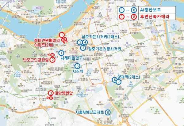 구는 이후 교육개발원 입구, 서초3동사거리, 사당역사거리, 남부터미널사거리 등으로 AI 횡단보도 설치를 확대했다.