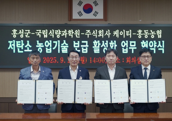 [금요저널] 홍성군은 29일 국립식량과학원, KT, 홍동농협과 함께 저탄소 농업기술 보급 활성화를 위한 4자간 업무협약을 체결했다고 밝혔다.
