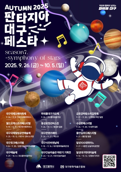 주요 공연으로는 토요시민콘서트, 판타지아대구페스타 가을축제인 ‘2025 대구예술제’ 와 청년버스킹 등 다양한 볼거리가 시민들이 즐겨 찾는 야외 도심 무대에서 열린다.