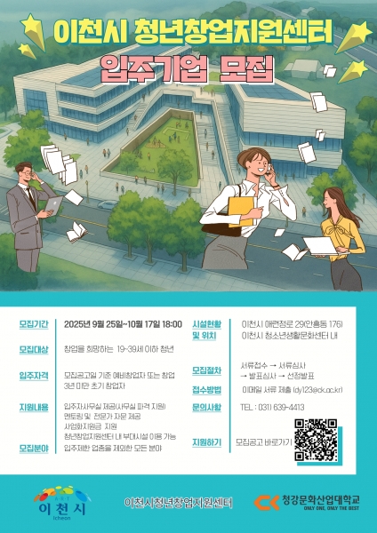 한편 이천시 청년창업지원센터는 청강문화산업대학교 산학협력단이 위탁 운영하며 이천시 애련정로 29 소재 청소년생활문화센터 2층에 자리한다.