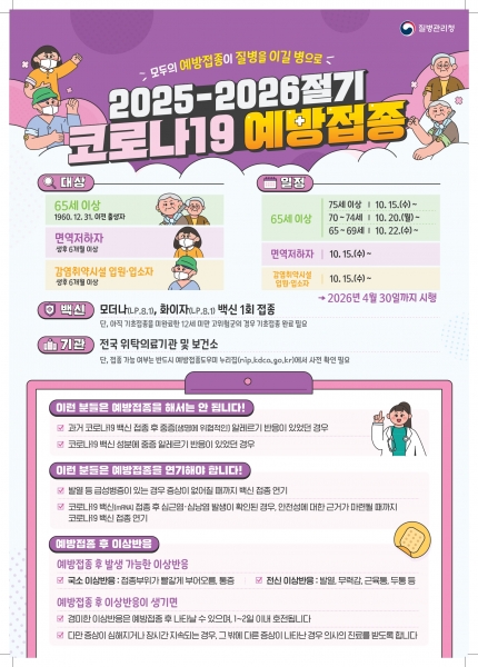 이번 접종은 65세 이상 어르신, 면역저하자·감염 취약 시설 입원 및 입소자를 대상으로 진행되며 안정적인 접종을 위해 나이별로 시작일을 구분한다.