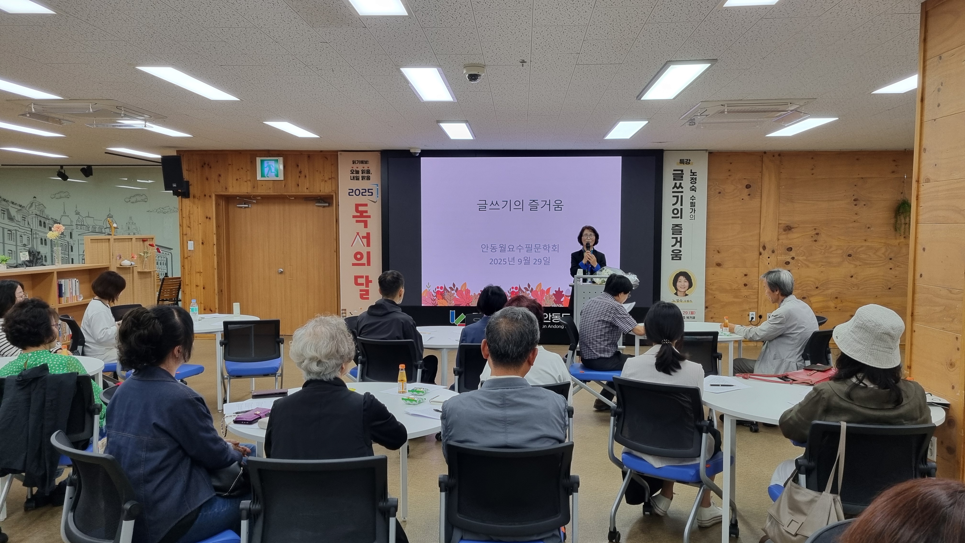 □ 경상북도교육청 안동도서관(관장 반선자)은 9월 29일(월) 19시도서관 북카페에서 월요수필문학회 회원 및 지역주민 50명 대상으로 노정숙 수필가 초청 특강을 성황리에 운영하였다.