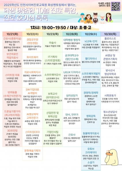 [금요저널] 인천광역시교육청은 10월 21일부터 30일까지 매주 화·수·목요일 인천사이버진로교육원 온라인 화상 시스템에서 ‘학생 맞춤형 10월 진로특강, 진로 호기심 톡톡’을 운영한다.