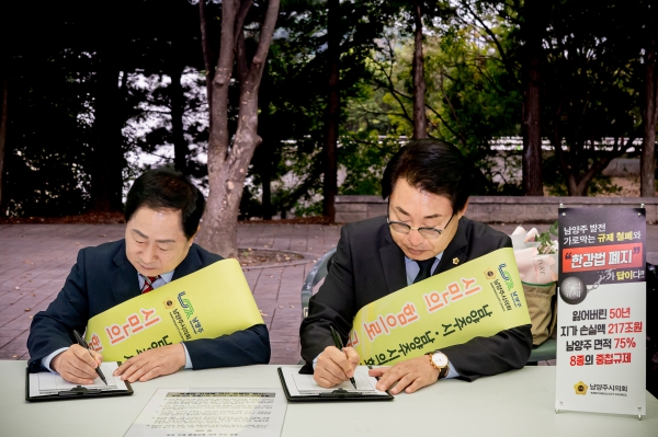 이어 “특별히 오늘 행사장에 남양주시와 남양주시의회가 함께 마련한 한강법 폐지 서명운동 부스가 운영되고 있다”고 밝히며 “지난 50여 년간 남양주에 가해진 한강법 등 각종 규제로 인해 큰 불편과 희생을 겪어오신 시민 여러분들의 고통을 덜어드리고 남양주의 새로운 미래를 열어가기 위해 불합리한 규제 철폐와 한강법 폐지는 반드시 이뤄내야 할 과제”고 강조했다.