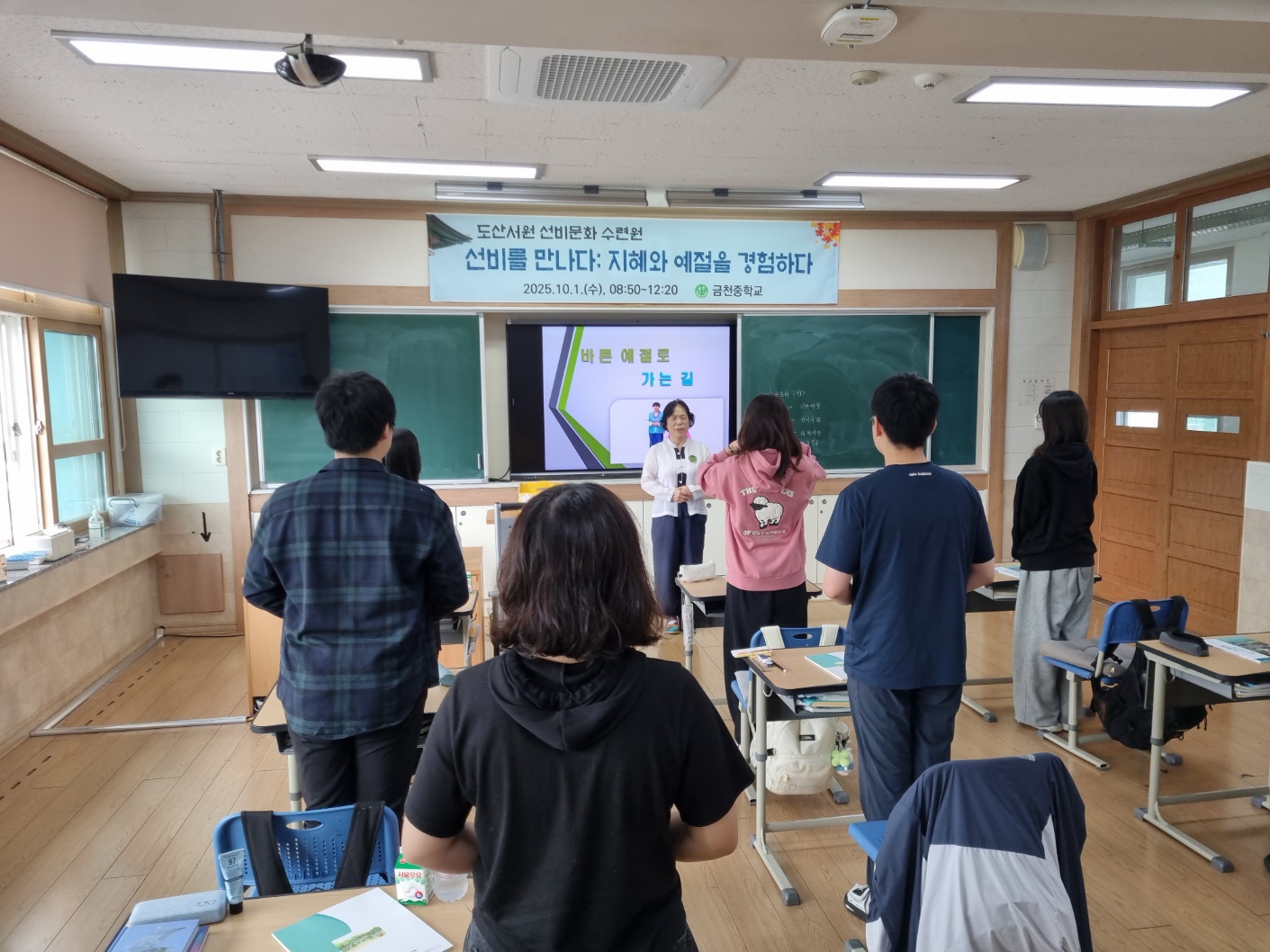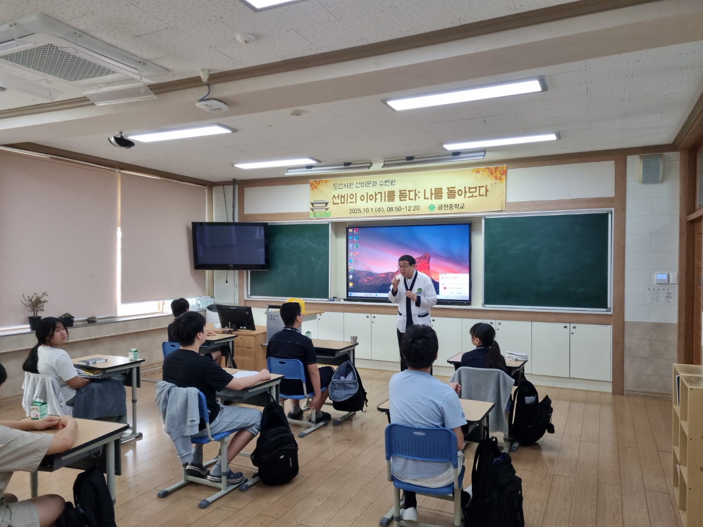 □ 금천중학교(교장 김준배)는 10월 1일(수), 도산서원 선비문화수련원 강사를 초청해 전교생을 대상으로 교과연계 인성교육을 진행했다. 이번 교육은 10월 언어폭력예방 및 언어문화개선 교육주간의 일환으로 마련되었으며, 학생들에게 올바른 언어 사용과 공감적 소통의 중요성을 일깨우는 뜻깊은 자리였다.