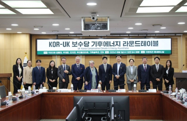 [금요저널] 국민의힘 김용태 국회의원은 1일 국회의원회관에서 열린 ‘KOR-UK 보수당 기후에너지 라운드테이블’에서 “지속가능한 녹색경제를 위해 보수정당 간 국제협력이 필요하다”며 ‘글로벌 녹색성장 보수정당 협의체’ 설립을 공식 제안했다 김 의원은 제안문을 통해 “보수정당이 산업 경쟁력·에너지 안보·기술 혁신을 기반으로 기후정책을 접근하는 것은 자연스러운 일”이며도, “이 세 가지 관점이 2050 넷제로라는 인류 공동 목표에 수렴해야 한다”고 강조했다.