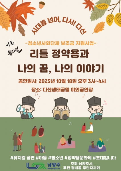 [금요저널] 남양주시는 오는 10월 18일 조안면 다산생태공원에서 아동·청소년 대상 가족뮤지컬인 ‘리틀 정약용’을 선보인다.
