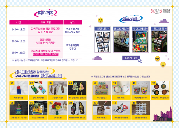 오후 2시부터 백제문화단지 사비골맛집 일원에서는 지역 예술인과 함께하는 다양한 문화예술 체험 부스와 버스킹 공연이 펼쳐져 축제 분위기를 한층 끌어올린다.