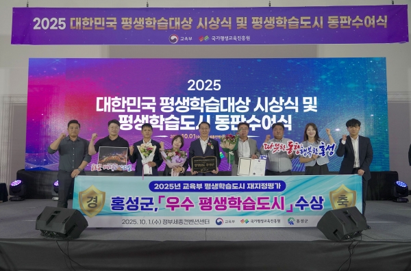[금요저널] 홍성군은 지난 1일 정부세종컨벤션센터에서 열린 ‘2025 대한민국 평생학습대상 및 평생학습도시 동판수여식’에서 교육부장관 기관표창을 수상하며 전국 평생학습 활성화를 선도하는 도시로 위상을 높였다.