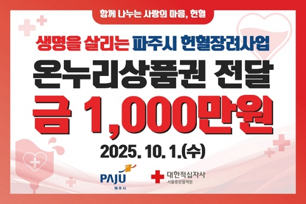 이한상 파주보건소장은 “헌혈장려지원금 지급이 혈액 수급 안정화와 헌혈 참여문화 확산에 기여하는 계기가 되길 기대한다”고 밝혔다.