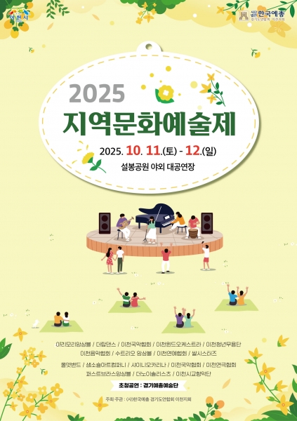 [금요저널] 한국예총 이천지회가 주최·주관하는 지역 예술인들의 축제인 ‘2025년 지역문화예술제’ 가 오는 10월 11일부터 12일까지 이틀간 오후 2시부터 오후 6시 30분까지 설봉공원 야외대공연장에서 개최된다.