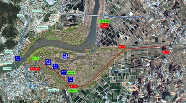 축제장에서 나가는 길은 제 1주차장의 경우 입구 반대편 출구를 이용해 물넘이 구간 삼거리로 진입해 제방도로나 영산천 방향으로 빠져나가면 된다.