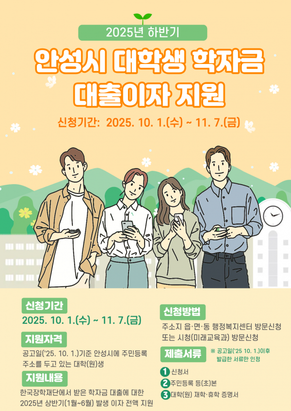 [금요저널] 안성시는 오는 10월 1일부터 11월 7일까지 ‘2025년도 하반기 안성시 대학생 학자금 대출이자’ 지원 신청을 받는다.
