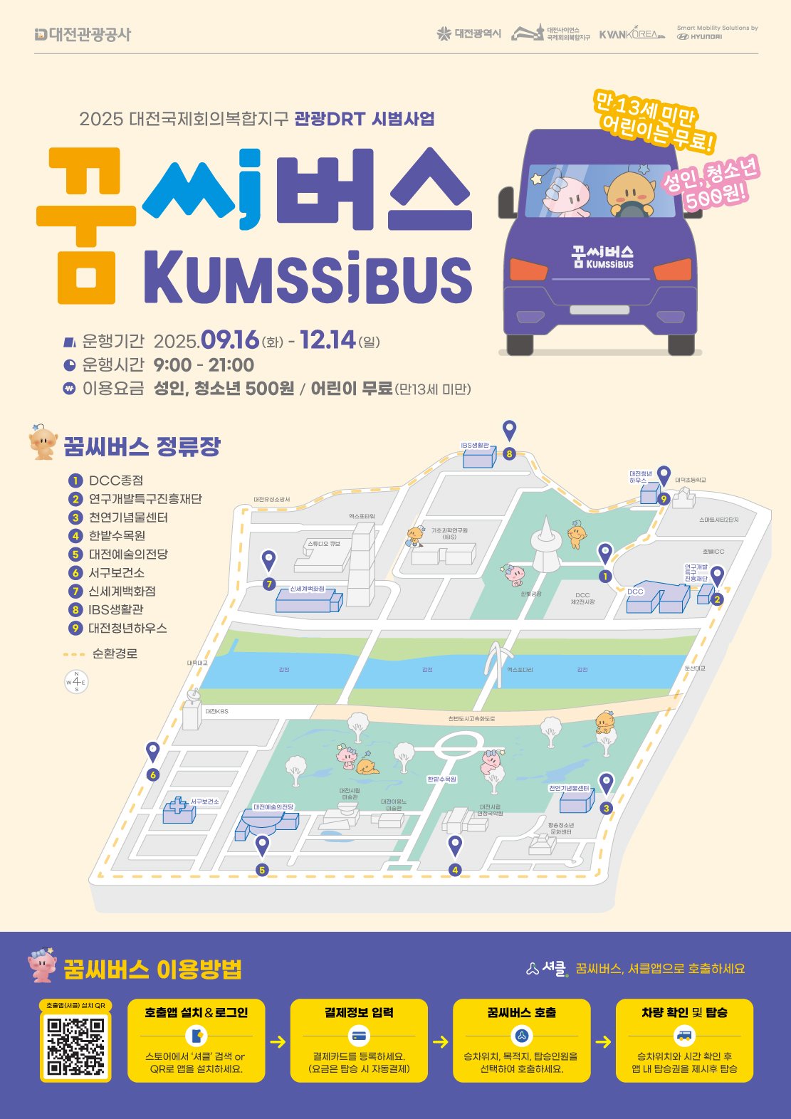 대전시는 이번 시범 사업을 “꿈씨버스”라는 이름으로 운영한다. 15인승 소형버스(12인석) 3대를 투입해 매일 오전 9시부터 오후 9시까지 운행하며, 대전컨벤션센터 제2전시장을 기점으로 천연기념물센터, 한밭수목원, 만년동 상권, 신세계백화점, 엑스포과학공원 등을 연결한다. 지정된 승·하차 지점에서 앱으로 호출하면 가까운 차량이 배정된다. 이용 요금은 500원이며, 초등학생 이하는 무료다. 이용을 원할 경우 앱스토어에서 ‘셔클앱’을 내려받아 가입 후 호출하면 된다.