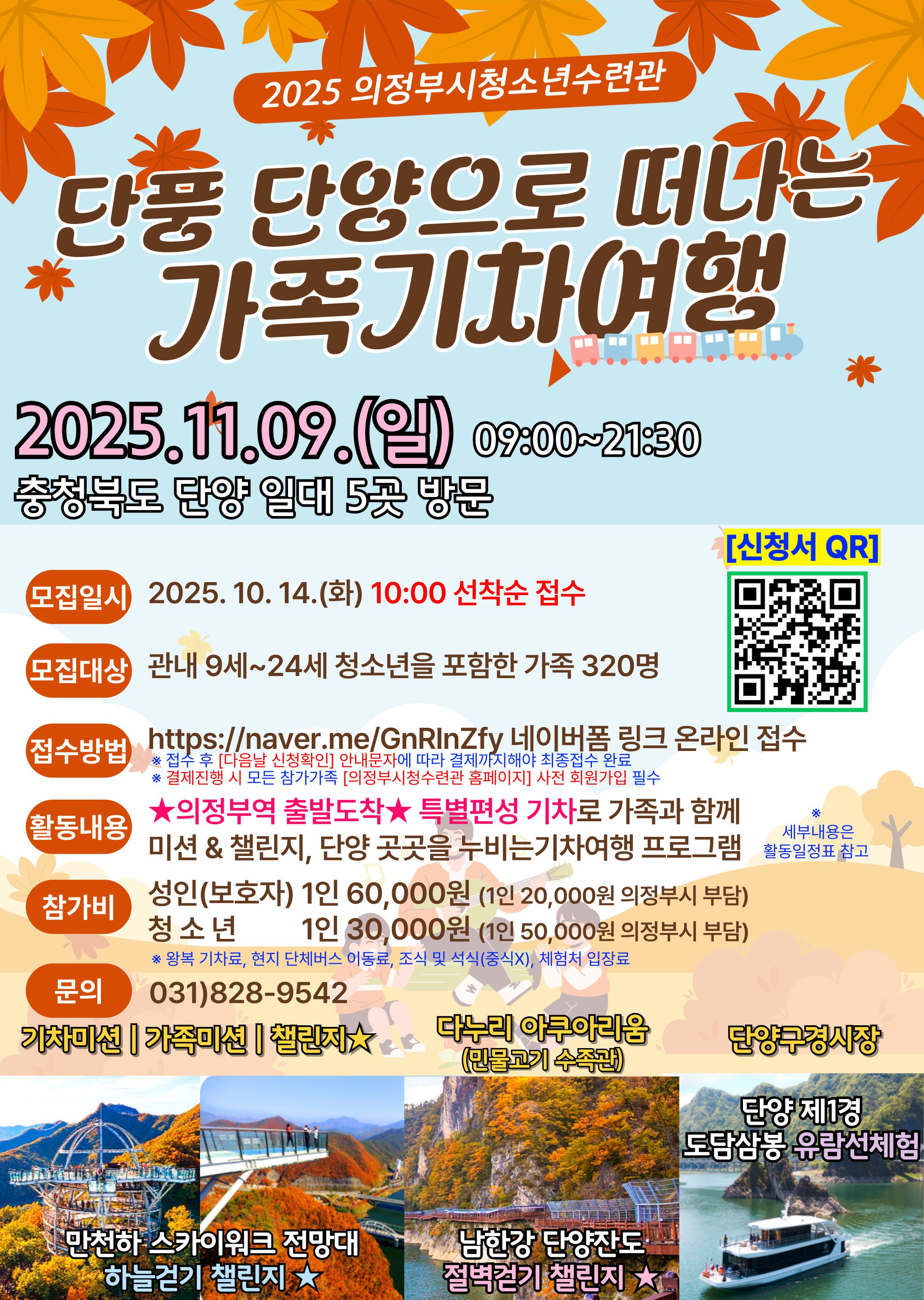 이번 행사는 단풍철 성수기를 맞아 의정부역에서 단양역까지 왕복 특별 기차편을 마련하였으며, 도담삼봉- 단양잔도- 만천하 스카이워크 전망대- 다누리 아쿠아리움- 구경시장 등 단양의 대표 명소를 탐방한다. 참가 가족은 두 팀으로 나뉘어 순환형 일정으로 운영되며, 현장에서 미션 & 챌린지 활동이 함께 진행되어 여행의 재미를 더할 예정이다.