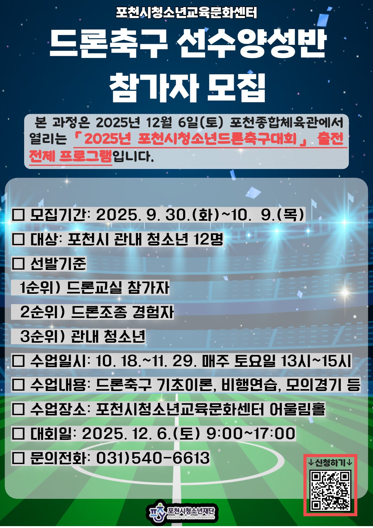 이번 프로그램은 12월 6일 포천종합체육관에서 열리는 ‘2025년 포천시 청소년드론축구대회’에 출전할 선수를 발굴- 육성하기 위해 마련했다. 참가 청소년들은 드론축구 기초이론, 비행 연습, 모의 경기 등 체계적인 훈련 과정을 거쳐 최종적으로 대회에 출전하게 된다.