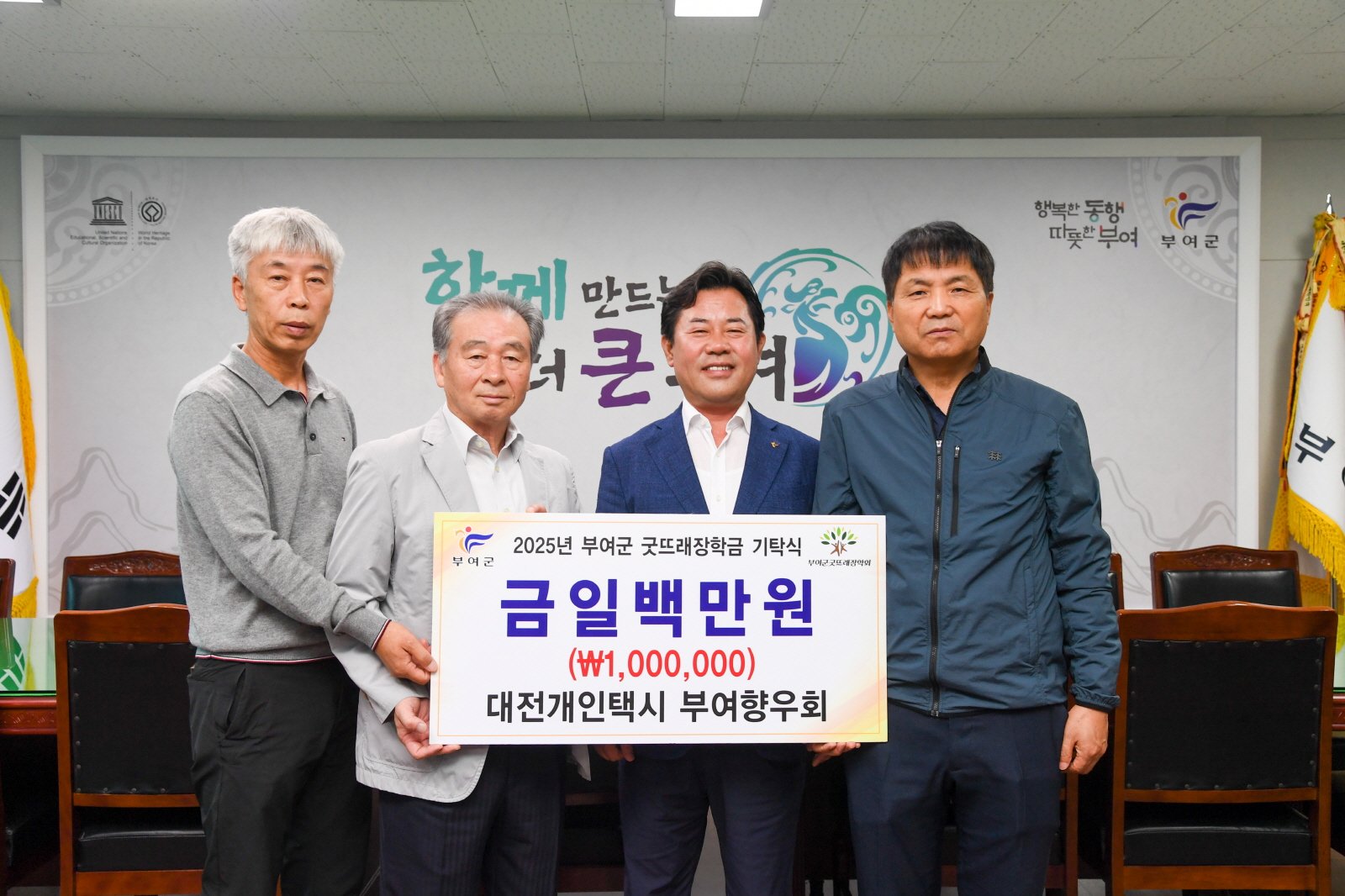 [금요저널] 대전개인택시 부여향우회(회장 추시연)가 지난 10일 (재)부여군굿뜨래장학회에 인재 육성을 위한 장학금 1백만원을 기탁했다.