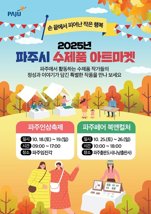 [금요저널] 파주시는 오는 18일부터 19일까지 이틀간 열리는 ‘파주인삼축제’ 와 오는 25일부터 26일까지 개최되는 ‘파주페어_북앤컬처’ 행사장에서 지역 수공예 작가들이 참여하는 ‘수제품 아트마켓’을 운영한다.