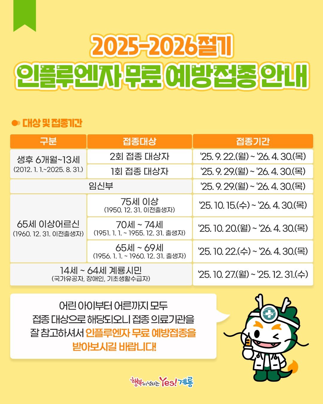 [금요저널] 계룡시(시장 이응우)는 겨울철 호흡기 감염병 유행에 대비해 내년 4월 30일까지 ‘2025-2026절기 인플루엔자(독감) 무료 예방접종’을 실시한다고 밝혔다.