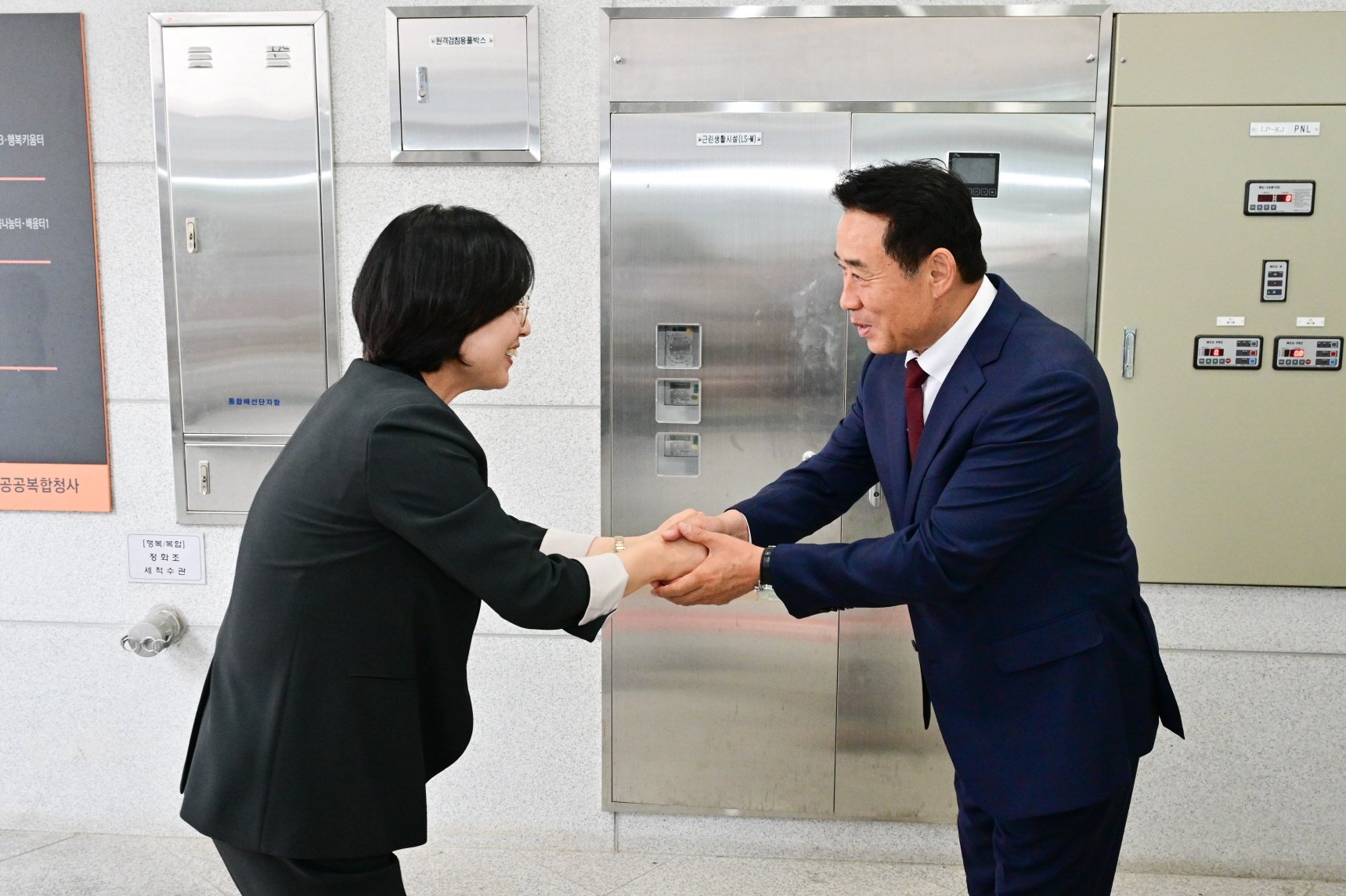 2 강동구 천호3동에 포천시 농특산물 상설판매장 ‘포천가득’ 개소 (이수희 강동구청장과 인사를 나누는 백영현 포천시장) (사진제공=포천시)