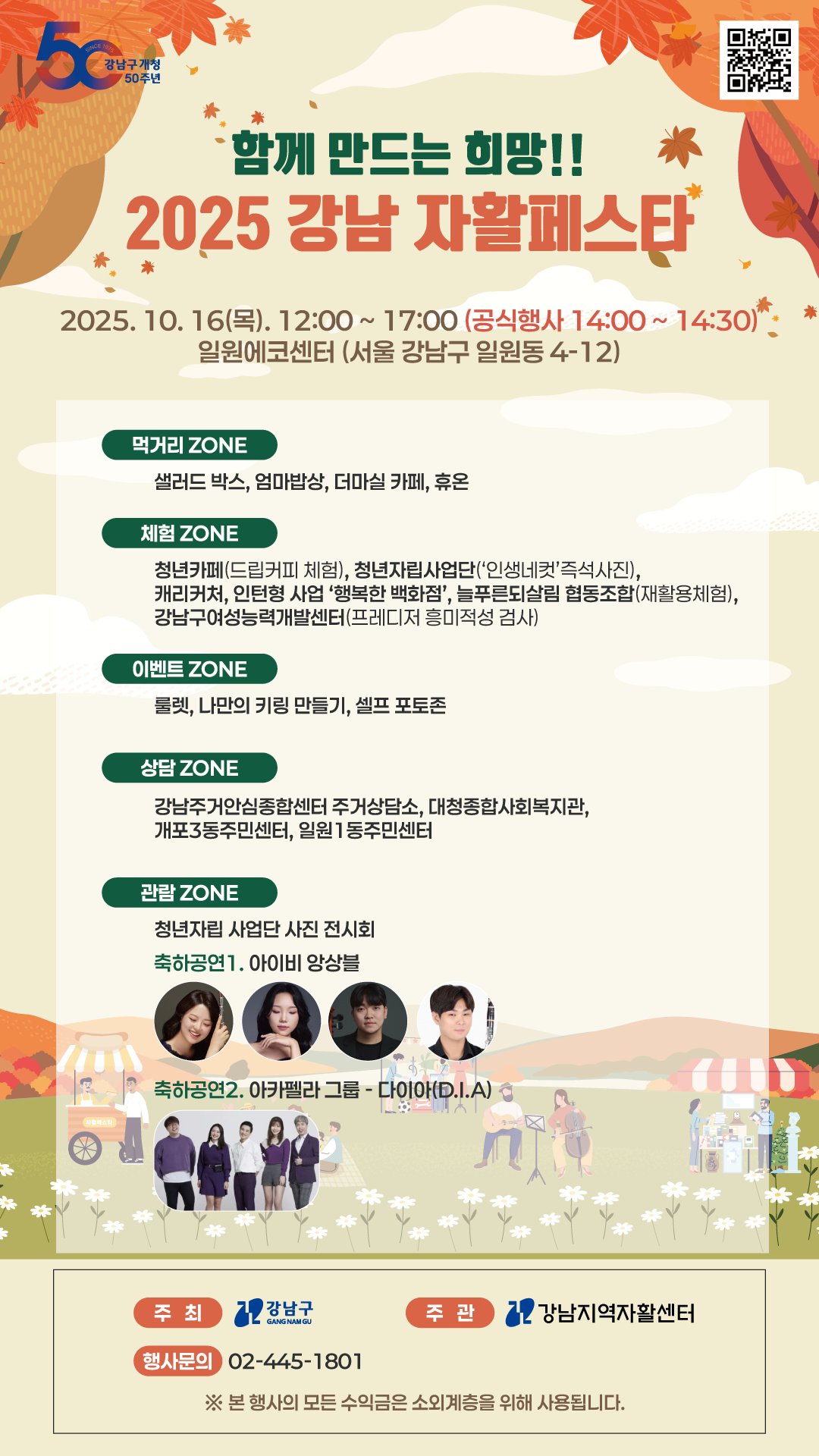 꿈이 모이는 도시, 미래를 그리는 강남구(구청장 조성명)가 10월 16일 낮 12시부터 오후 5시까지 일원에코센터에서 ‘2025 강남 자활페스타’를 개최한다.