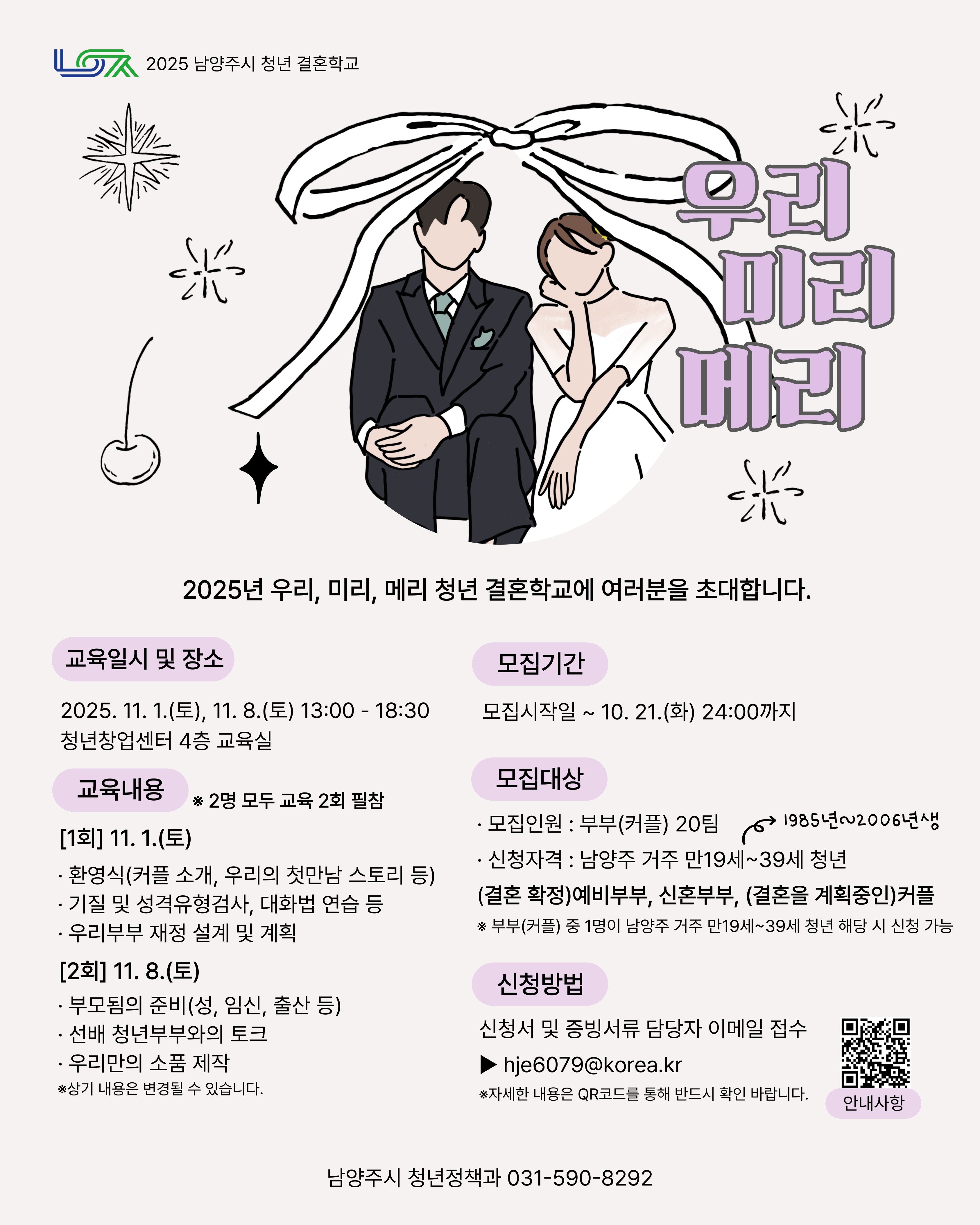 [금요저널] 남양주시(시장 주광덕)는 13일부터 21일까지 청년들의 결혼에 대한 심리적 불안감을 덜어주고 안정적인 결혼생활을 지원하기 위한 ‘2025 청년 결혼학교’의 참여자를 모집한다고 밝혔다.