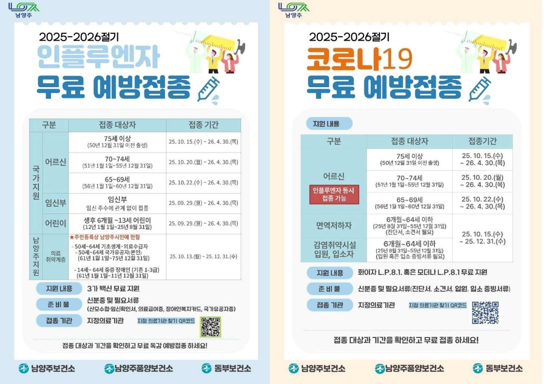 [금요저널] 남양주시(시장 주광덕)는 9월 22일부터 내년 4월 30일까지 ‘2025-2026절기 코로나19- 인플루엔자 예방접종 사업’을 추진한다고 밝혔다.