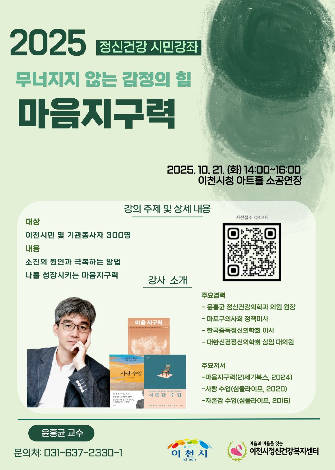 [금요저널] 이천시정신건강복지센터는 오는 10월 21일(화) 오후 2시부터 4시까지 이천아트홀 소공연장에서 2025년 정신건강 시민강좌 ‘무너지지 않는 감정의 힘, 마음 지구력’을 개최한다.