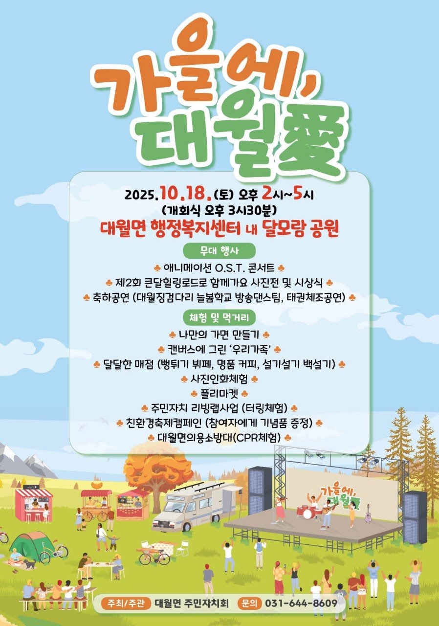 [금요저널] 이천시 대월면 주민자치회(회장 정재문)는 오는 10월 18일(토) 오후 2시부터 5시까지 대월면 행정복지센터 내 달모람공원에서 주민과 가족이 함께하는 문화축제 ‘가을에, 대월애()’ 행사를 개최한다.