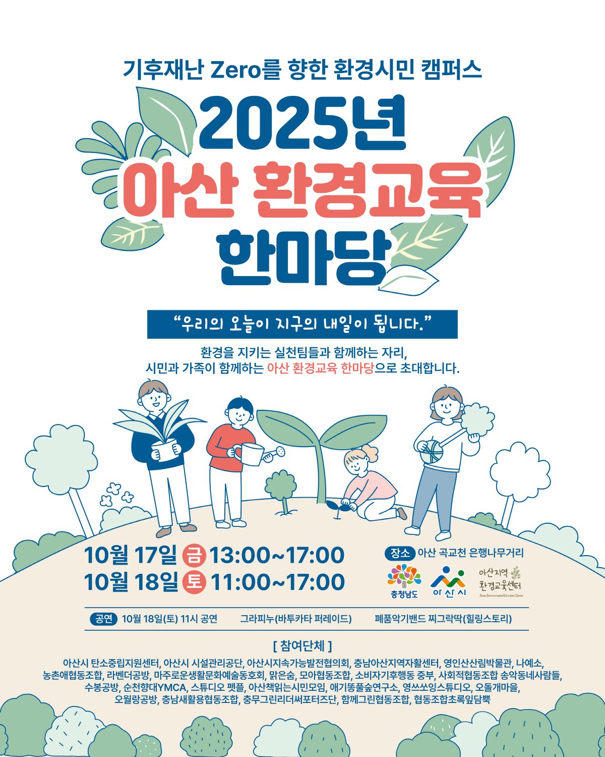 오는 10월 17~18일에는 곡교천 여해나루 일원에서 ‘기후재난 Zero를 향한 환경시민 캠퍼스’를 주제로 ‘2025 환경교육 한마당 및 탄소중립 실천 확산대회’ 가 열린다.