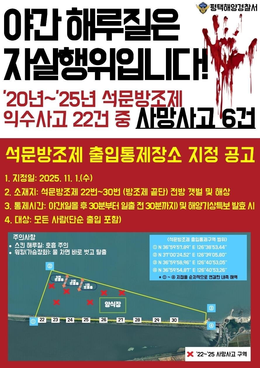 [금요저널] 당진시(시장 오성환)는 ‘연안사고 예방에 관한 법률’에 근거해 11월 1일부터 석문방조제 22번~30번 구간에 대한 야간 출입 통제를 실시한다고 14일 밝혔다.