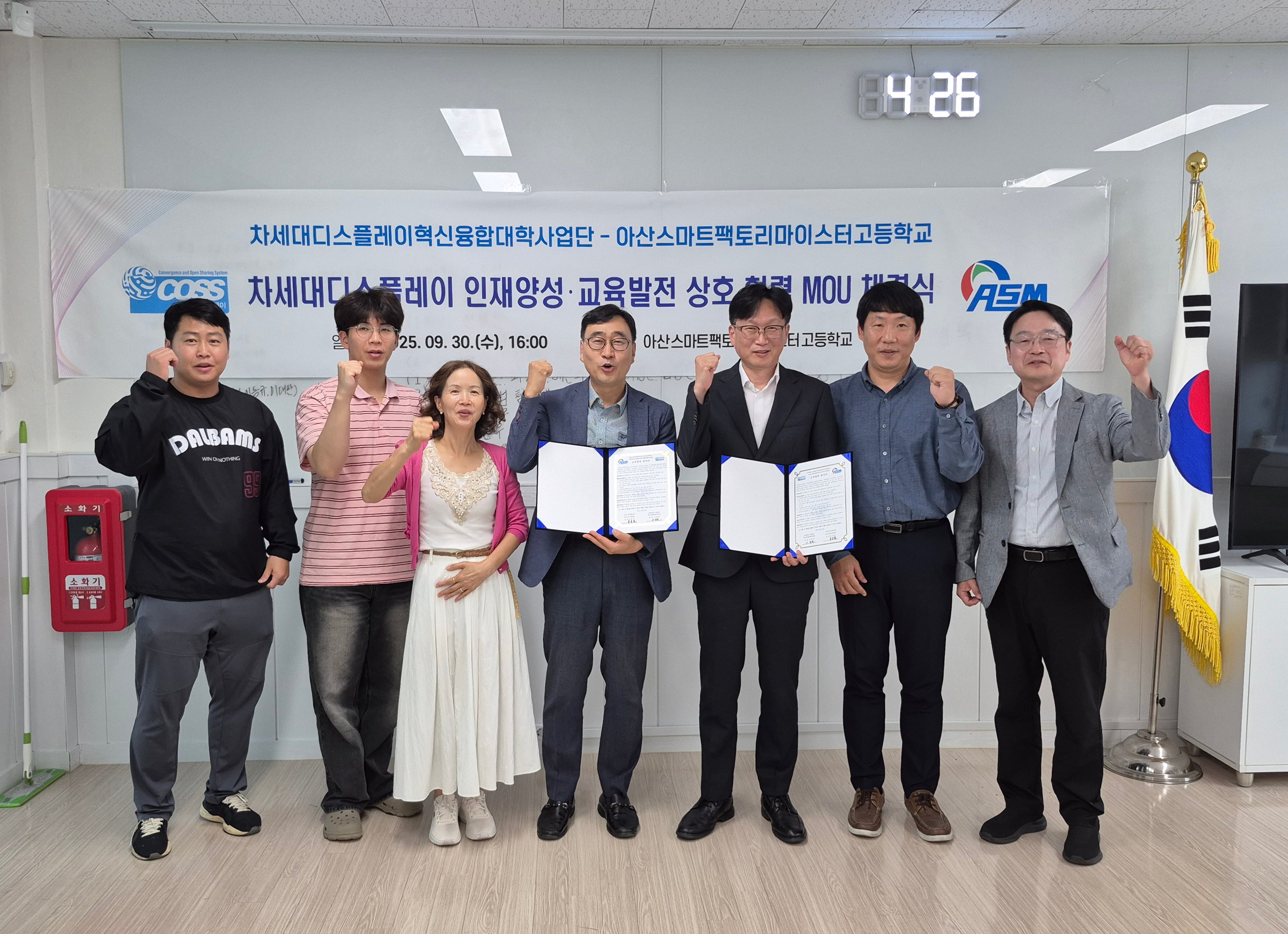 아산스마트팩토리마이스터고(교장 조동헌, 이하 아스마고)는 9월 30일 차세대디스플레이혁신융합대학사업단과 차세대디스플레이 인재양성·교육발전을 위한 사업 협약을 체결했다고 밝혔다.