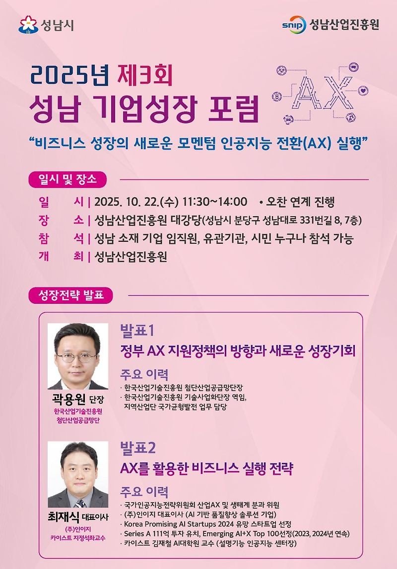성남산업진흥원은 오는 10월 22일 11시 30분부터 ‘인공지능 전환 실행 전략’을 주제로 2025년 제3회 ‘성남기업성장포럼’을 개최한다.
