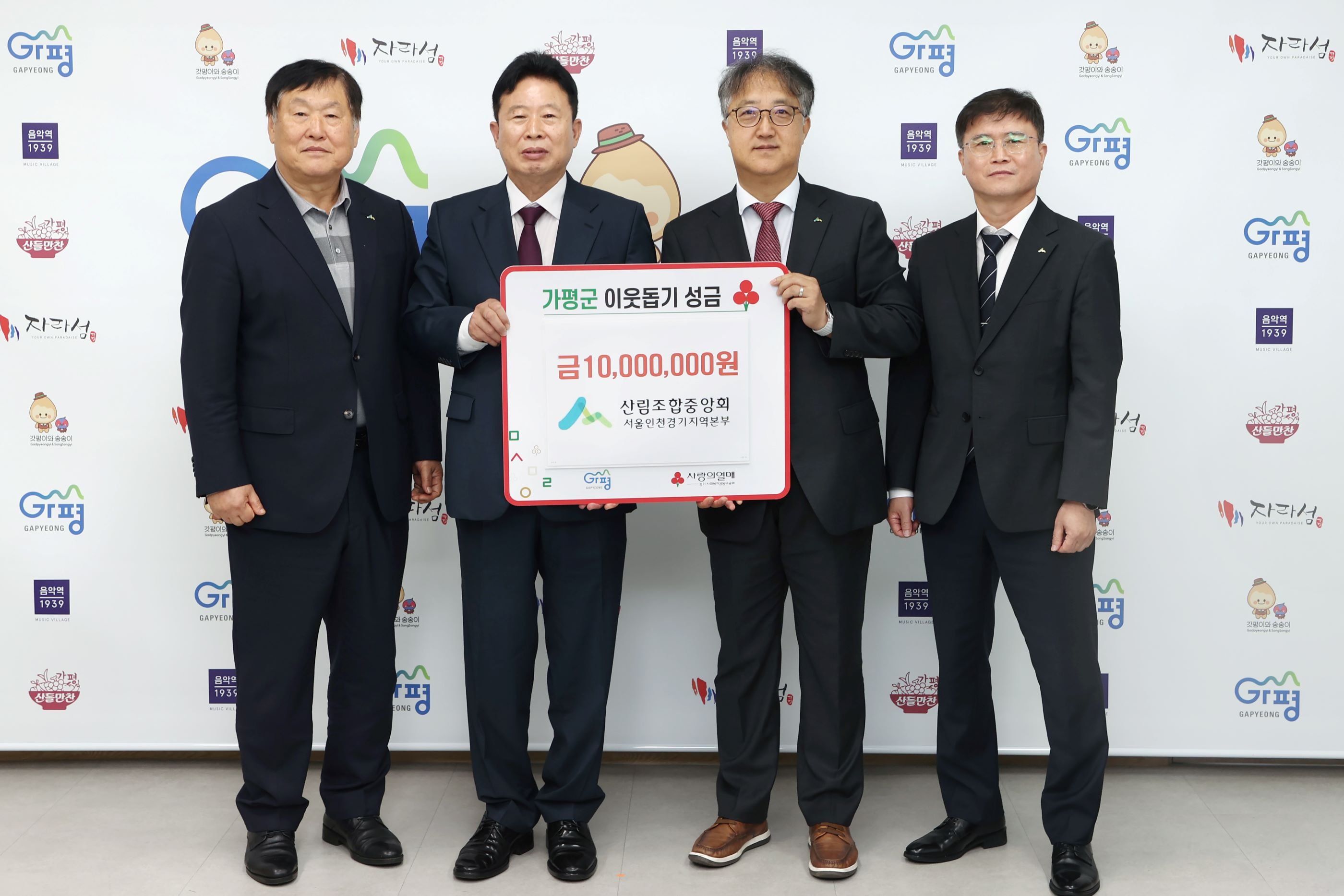 [금요저널] 산림조합중앙회 서울인천경기지역본부는 13일 가평군청을 방문해 지역의 어려운 이웃을 돕기 위한 성금 1천만원을 기탁했다.