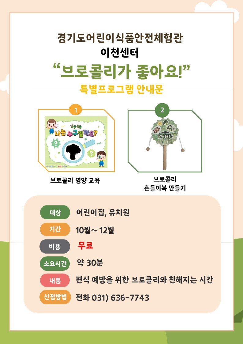 [금요저널] 이천시 어린이식품안전체험관은 오는 10월부터 12월까지 특별프로그램 ‘브로콜리가 좋아요’를 운영한다고 밝혔다.