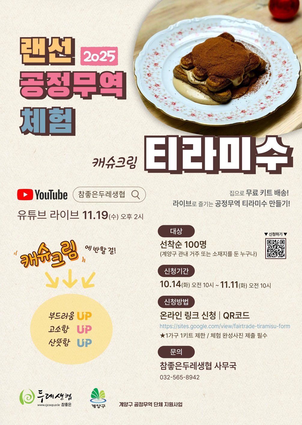 [금요저널] 인천광역시 계양구(구청장 윤환)는 공정무역에 대한 구민의 관심과 참여를 높이기 위해 10월 14일부터 ‘2025 랜선 공정무역 체험(캐슈크림 티라미수 만들기)’ 참여자를 모집한다고 밝혔다.